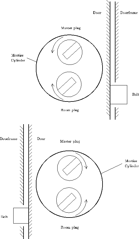 The direction to turn the plug depends on the bolt mechanism, not on the lock, but here are some general rules. Cheap padlocks will open if the plug is turned in either direction, so you can chose the directionh which is best for the torque wrench. All padlocks made by the Master company can be opened in either direction. Padlocks made by Yale will only open if the plug is turned clockwise. The double plug Yale cylinder locks generally open by turning the bottom of the keyway (i.e., the flat edge of the key) away from the nearest doorframe. Single plug cylinder locks also follow this rule. See Figure 9.1. Locks built in to the doorknob usually open clockwise. Desk and filing cabinet locks also tend to open clockwise.