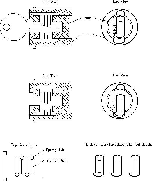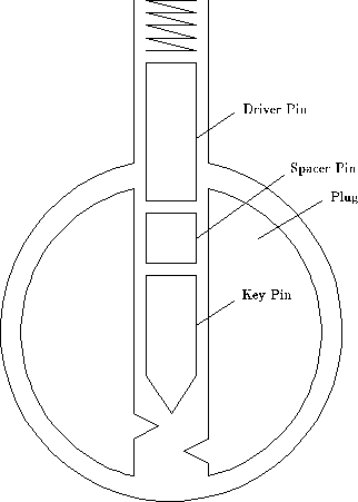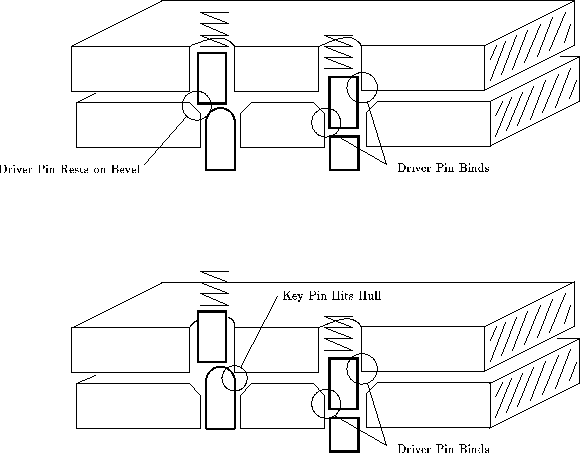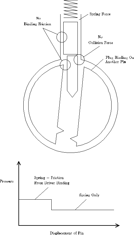 The top half of Figure 9.3 shows a pin column with a driver pin that has a larger diameter than the key pin. As the pins are lifted, the picking pressure is resisted by the binding friction and the spring force. Once the driver clears the sheer line, the plug rotates (until some other pin binds) and the only resistance to motion is the spring force. If the key pin is small enough and the plug did not rotate very far, the key pin can enter the hull without colliding with the edge of the hull. Some other pin is binding, so again the only resistance to motion is the spring force. This relationship is graphed in the bottom half of the Figure. Basically, the pins feel normal at first, but then the lock clicks and the pin becomes springy. The narrow key pin can be pushed all the way into the hull without loosing its springiness, but when the picking pressure is released, the key pin will fall back to its initial position while the large driver catches on the edge of the plug hole.