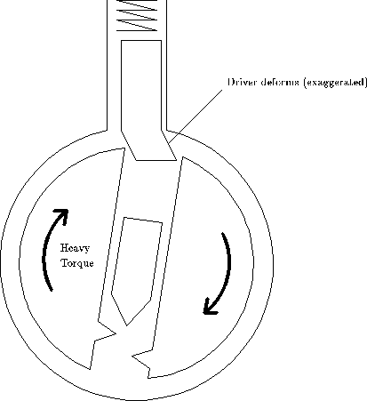Deformation can be used to your advantage if you want to force several pins to bind at once. For example, picking a lock with pins that prefer to set from front to back is slow because the pinsset one at a time. This is particularly true if you only apply pressure as the pick is drawn out of the lock. Each pass of the pick will only set the frontmost pin that is binding. Numerous passes are required to set all the pins. If the preference for setting is not very strong (i.e., the axis of the plug holes is only slightly skewed from the plug's center line), then you can cause additional pins to bind by applying extra torque. Basically, the torque puts a twist in the plug that causes the front of the plug to be deflected further than the back of the plug. With light torque, the back of the plug stays in its initial position, but with medium to heavy torque, the front pin columns bend enough to allow the back of the plug to rotate and thus cause the back pins to bind. With the extra torque, a single stroke of the pick can set several pins, and the lock can be opened quickly. Too much torque causes its own problems.