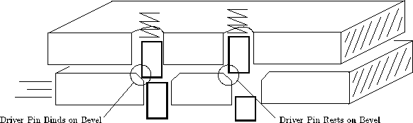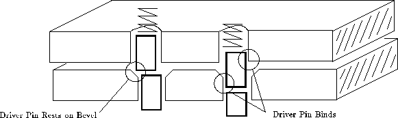 A lock with beveled plug holes requires more scrubbing to open than a lock without beveled holes because the driver pins set on the bevel instead of setting on the top of the plug. The plug will not turn if one of the drivers is caught on a bevel. The key pin must be scrubbed again to push the driver pin up and off the bevel. The left driver pin in Figure 9.6a is set. The driver is resting on the bevel, and the bottom plate has moved enough to allow the right driver to bind. Figure 9.6b shows what happens after the right driver pin sets. The bottom plate slides further to the right and noe the left driver pin is scissored between the bevel and the top plate. It is caught on the bevel. To open the lock, the left driver pin must be pushed up above the bevel. Once that driver is free, the bottom plate can slide and the righ driver may bind on its bevel.